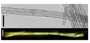 Organisation hiérarchique des nanotubes de verres vue en microscopie électronique (gauche, barre : 100nm) en lumière polarisée (droite, barre 1mm).