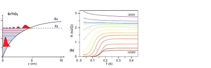 A gauche : Puits de potentiel formé par la courbure de la bande de conduction (Ec) du SrTiO3 à l’interface avec LaTiO3. Les sous-bandes d’énergies dis¬crètes sont remplies jusqu’au niveau de Fermi Ef. L’enveloppe de la fonction d’onde électronique de la première et celle de la dernière bande remplie sont représentées en trait plein